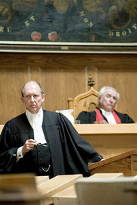 prosectuor Aemelius Irving (Dean Hall) listens to Defence council